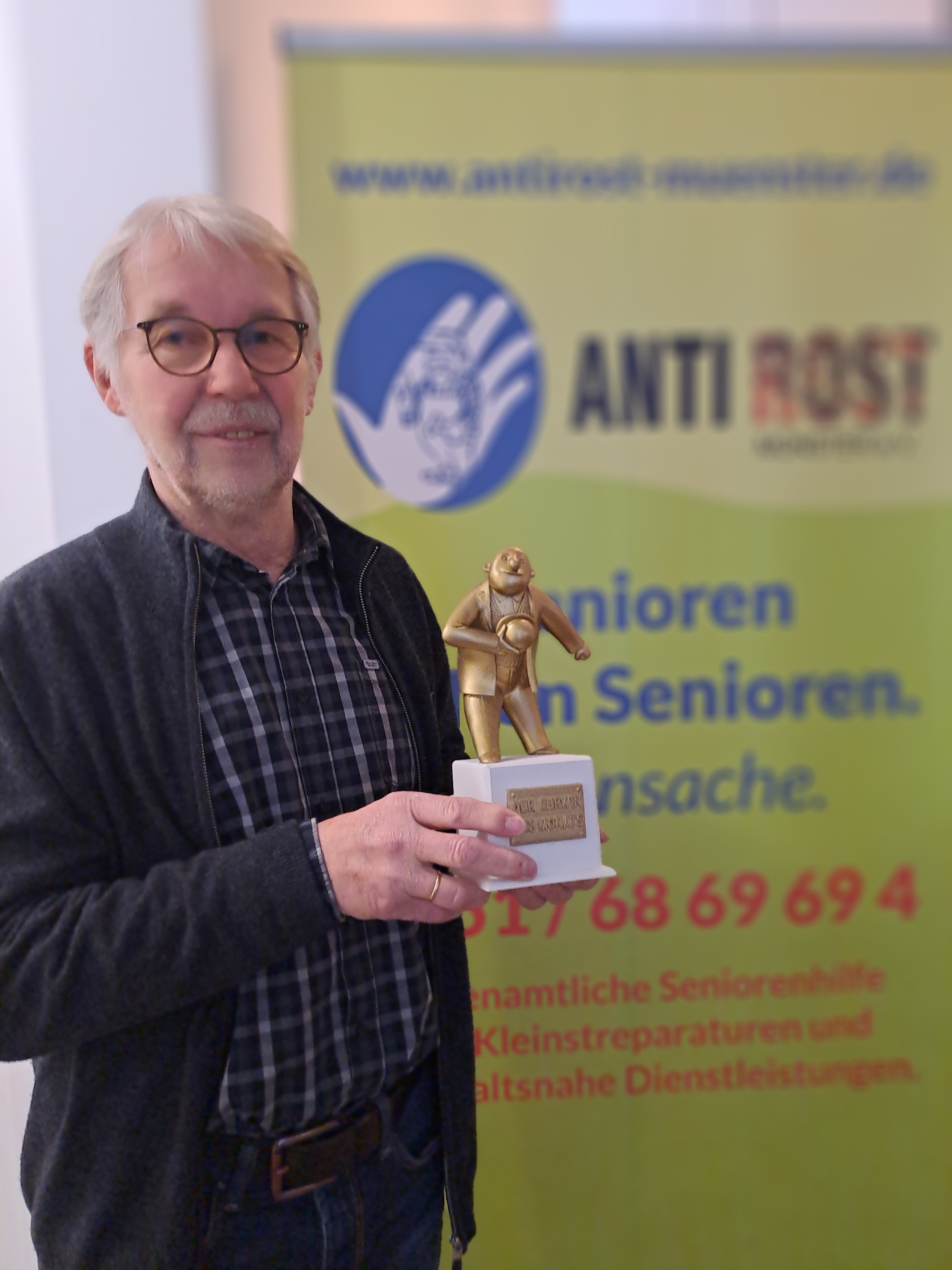 Traditionell wird der „Ehrwin“ stellvertretend an eine einzelne Person überreicht. Für ANTI ROST Münster nahm Willi Peters diese besondere Auszeichnung entgegen. Als Gründungsmitglied, aktiver Helfer und Vorstandsmitglied steht er seit über 20 Jahren beispielhaft für den Einsatz, die Arbeitsweise und das Selbstverständnis unseres Vereins.