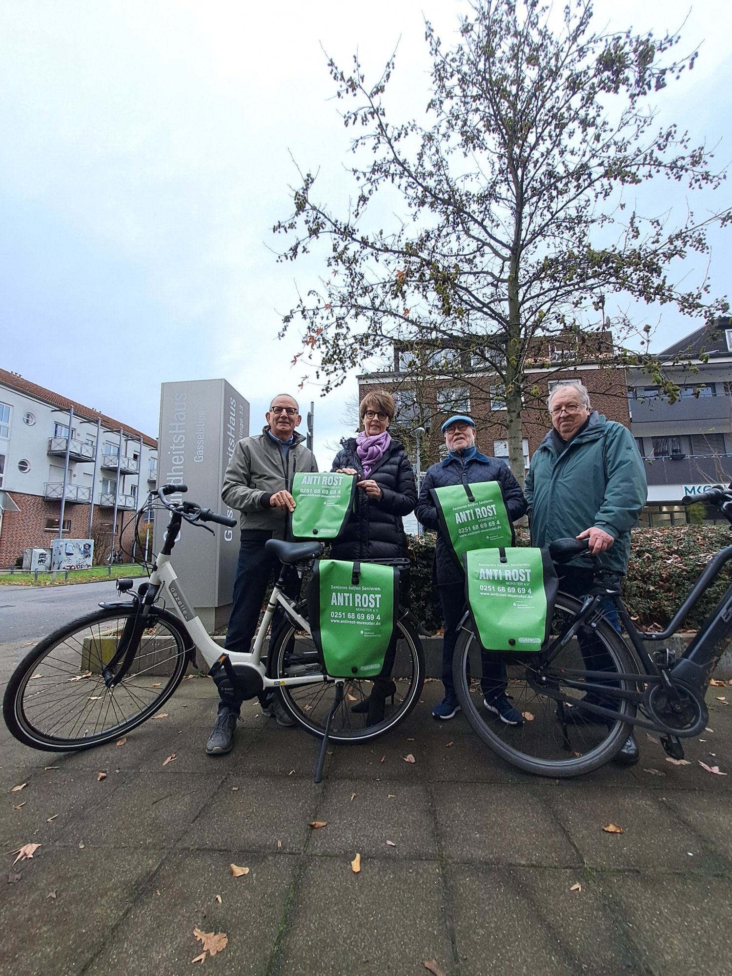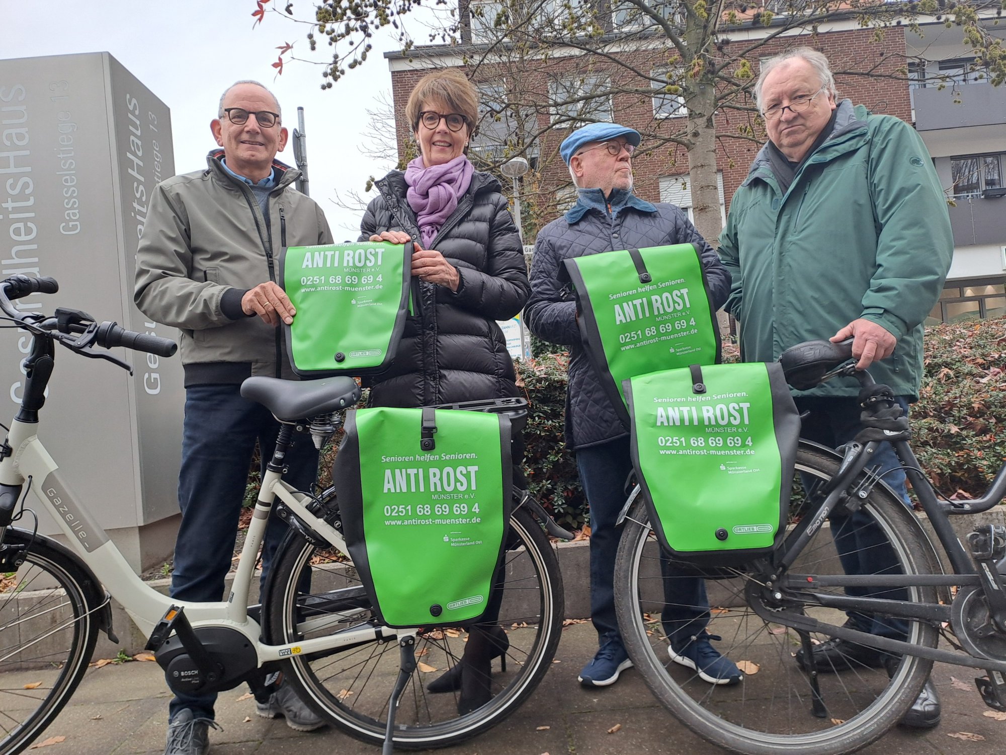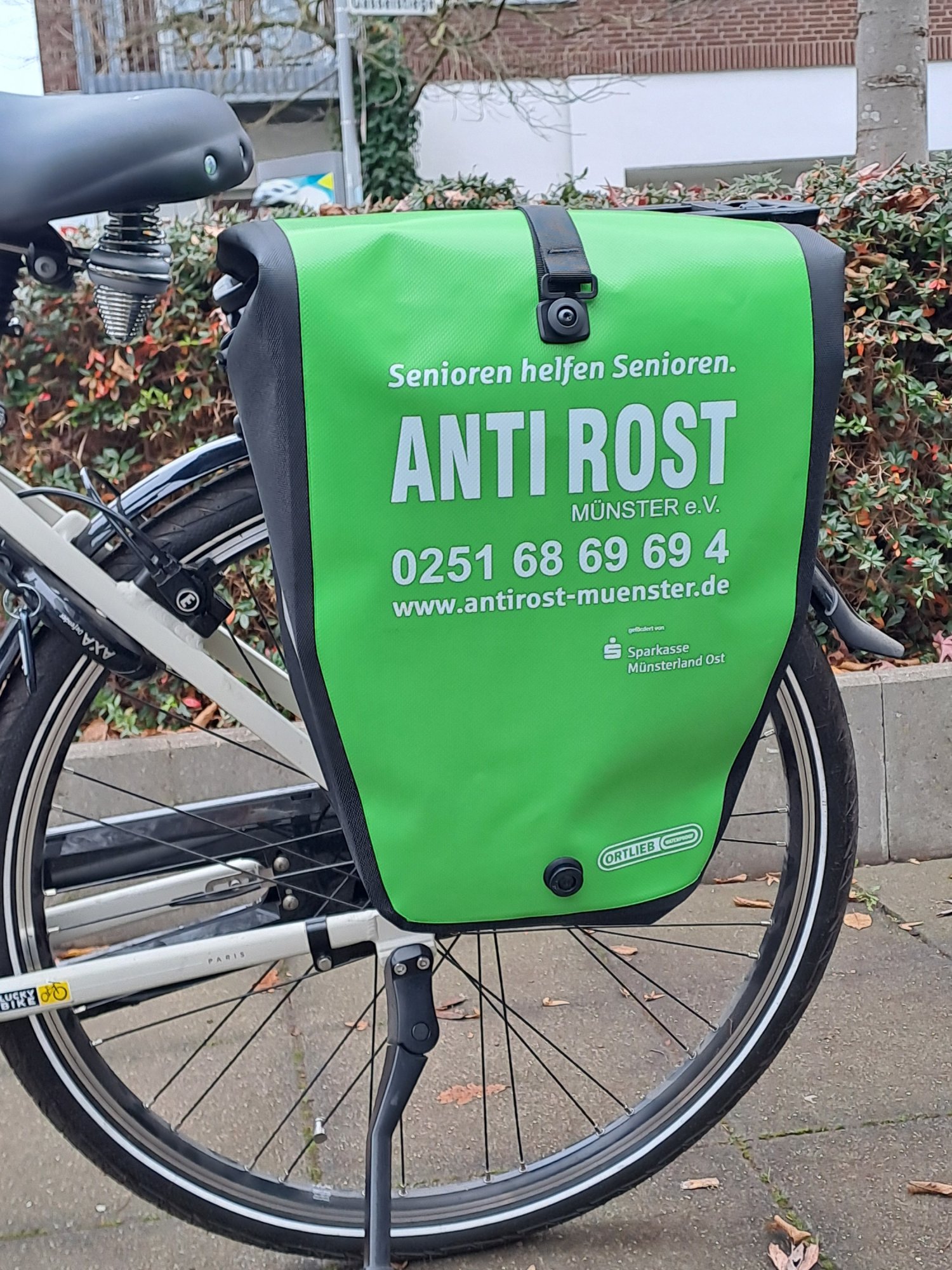 Die Sparkasse unterstützt schon seit Jahren den Verein ANTI ROST Münster e.V. und schätzt den wertvollen Beitrag der vielen ehrenamtlichen Helfer für ältere Menschen in Münster. Die neuen, leuchtend grünen Gepäckträgertaschen begleiten das Helferteam auf ihren Fahrten durch die Stadt zu den handwerklichen Einsätzen. Gleichzeitig dienen diese Taschen als“Botschafter” des tollen Angebots von ANTI ROST, nämlich Senioren helfen Senioren. Für diesen guten Zweck hat die Sparkasse großzügig die Anschaffung der Radtaschen ermöglicht.
