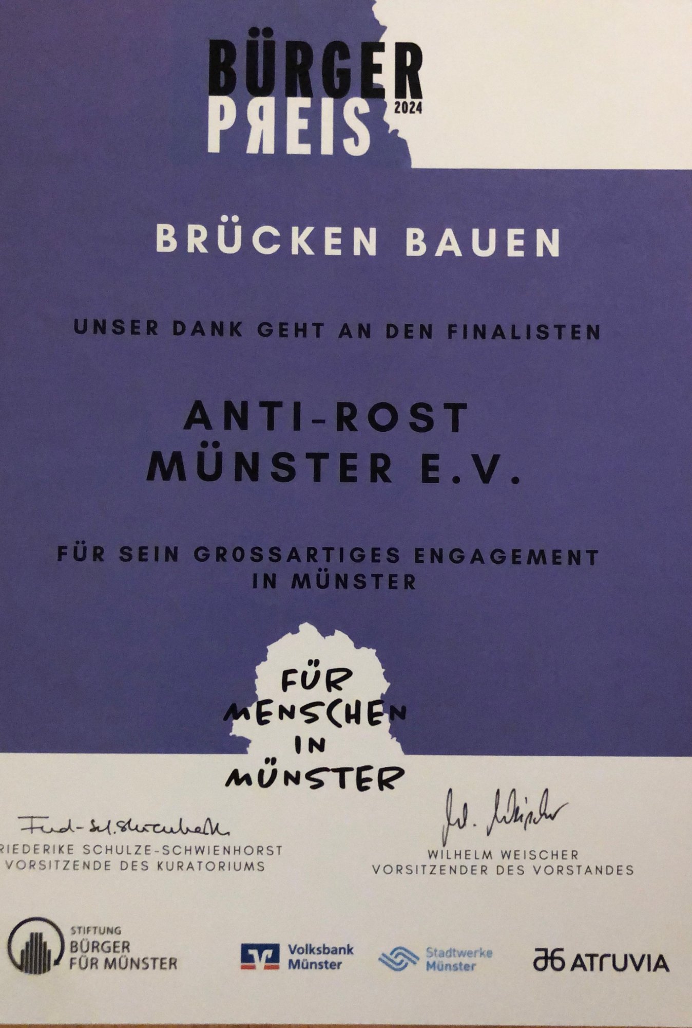 ANTI ROST wurde in Münster für den Bürgerpreis 2024, unter dem Motto „Brücken bauen“, nominiert.